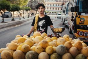 “Garma lena hai bhai? 80 rupay kilo hey! (Do you want to buy sweet melons, brother? They are 80 Rupees/kilo!)” I turn left and see