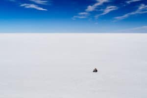 Salar de Uyuni in Bolivia at above 3600 m elevation is the world’s largest salt flat (12,106 square km). It is so vast and perfectly